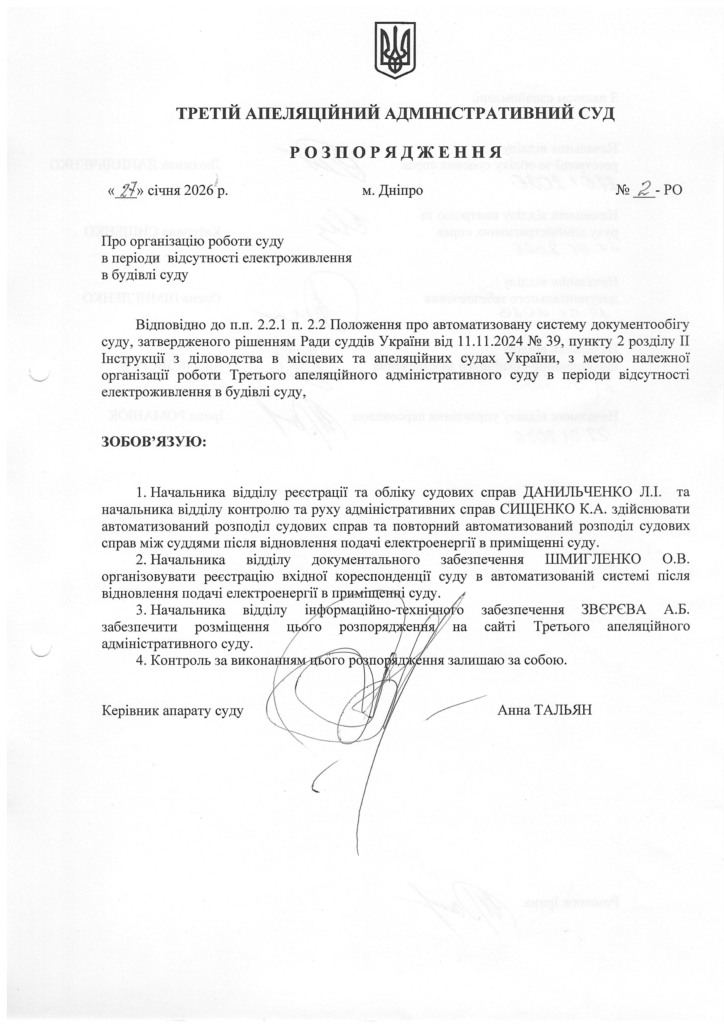 Організація роботи суду у періоди відсутності електроживлення в будівлі Третього апеляційного адміністративного суду здійснюється відповідно до розпорядження керівника апарату суду від 27 січня 2026 року № 2-РО.